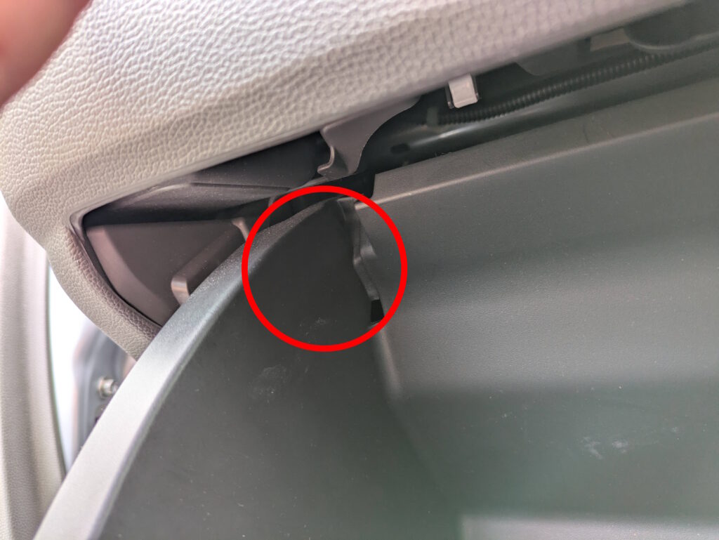 ちょうど赤丸部分あたり。ボックス内側に少し押してあげると外れます。