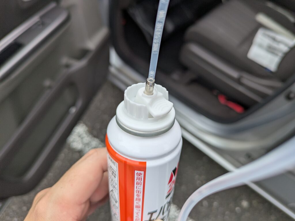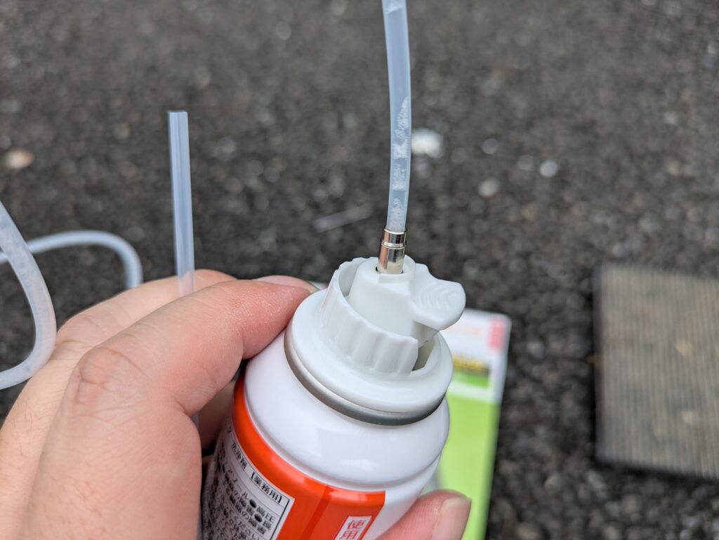 チューブを缶の注入口に装着しまして・・・(落ちすぎると洗浄剤が出るので回しながら装着)